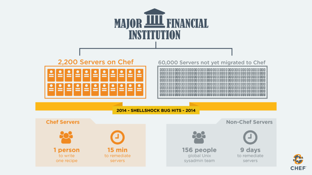 When Shellshock hit in 2014, a major financial institution we work with saw drastic differences in its servers that were treated as code using Chef and those that had not yet migrated.