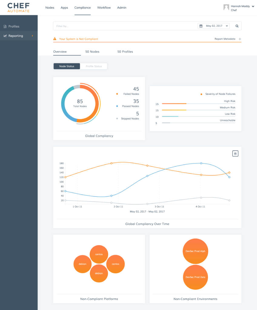 Better insight of compliance state and profile data is now available by default in the Chef Automate GUI. The new views are available from the top-level navigation bar. This compliance section provides access to both profile data and reporting capabilities. This is the same view introduced at ChefConf 2017, now generally available with no special activation required.