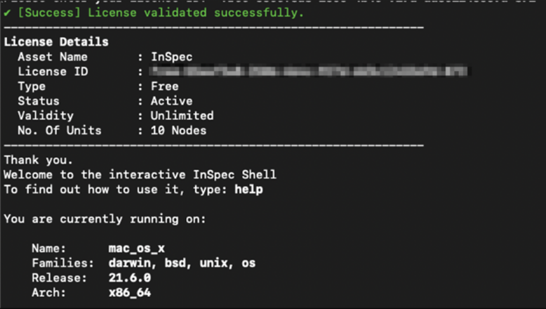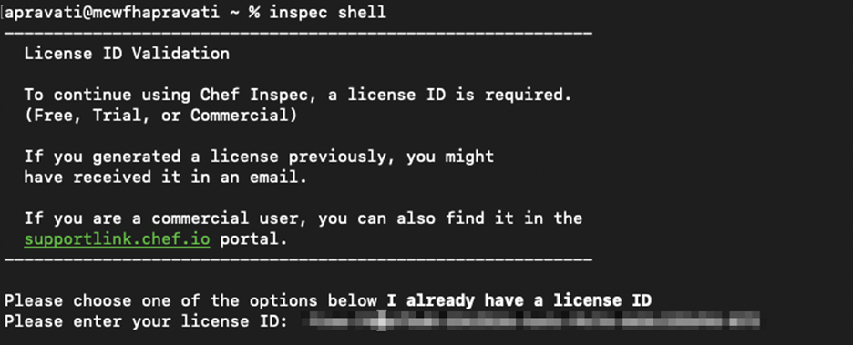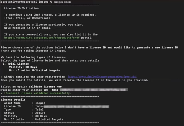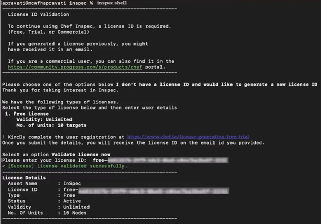 $ inspec shell. - Select the second option (I don’t have a license ID…).