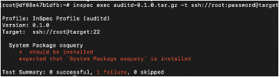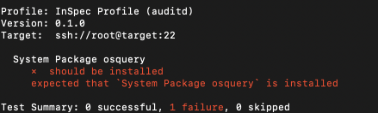 Example of failed test case – You’ll be testing for the package Osquery installed on your target node, which is not the case. So, the resulting result is failed.