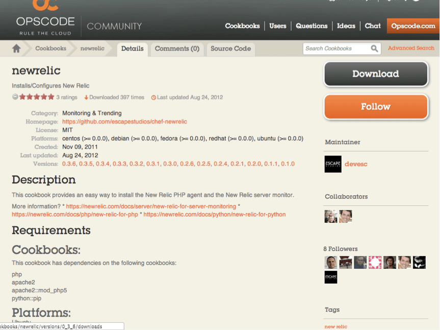 1) Preview and download a New Relic cookbook and drop it into the chef repo. This well-maintained cookbook is from Escape Studios.