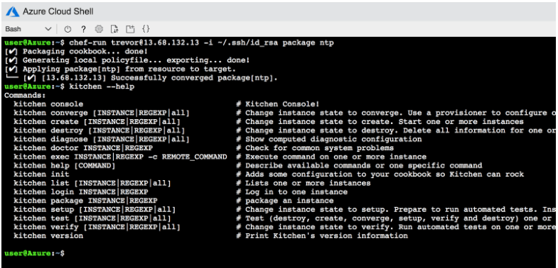 This week, at Microsoft Ignite, we’re announcing the availability of Chef Workstation in Azure Cloud Shell! Now you can run all of your Chef utilities and InSpec right from Cloud Shell. You can utilize commands like:
