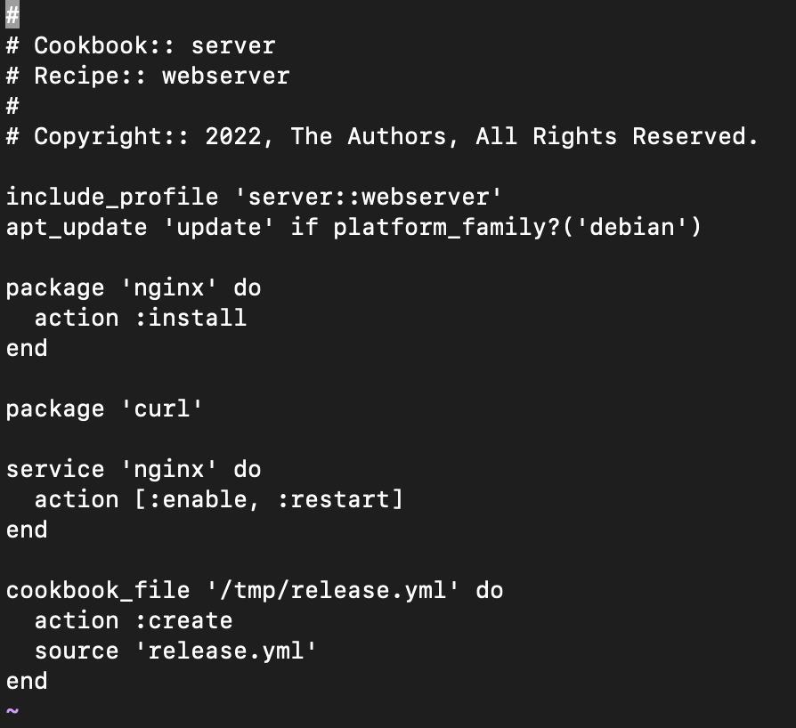 - Recipe: The recipe below will install and start the nginx server on the remote node. Along with installation, it will push the waiver