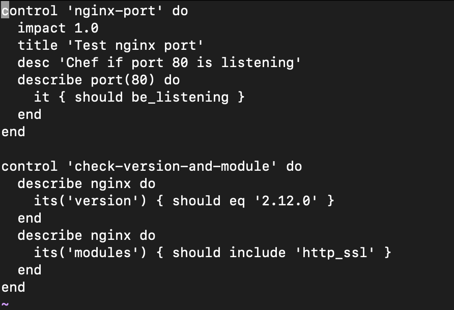 - Example: Below, compliance has two controls. The first will check whether port 80 is listening, and the second will contain the version and the modules, respectively.