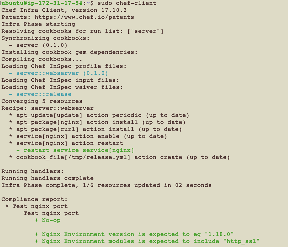 nginx-port is skipped,and the other two controls are executed. $ sudo chef-client command will execute the cookbook in the target node along with all the recipes, compliance and waivers files.