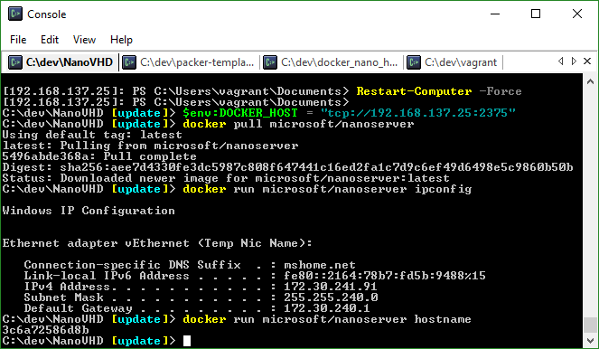 C:\dev\NanoVHD [update]> docker pull microsoft/nanoserver Using default tag: latest latest: Pulling from microsoft/nanoserver 5496abde368a: Pull complete Digest: sha256:aee7d4330fe3dc5987c808f647441c16ed2fa1c7d9c6ef49d6498e5c9860b50b Status: Downloaded newer image for microsoft/nanoserver:latest