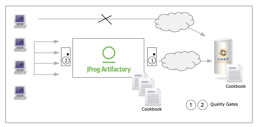 - consistent and reliable access to Cookbooks on Chef Supermarket, see [11], via Artifactory Remote Repositories, see Illustration 2. Access can be channeled via Artifactory. This allows to implement Quality Gates.