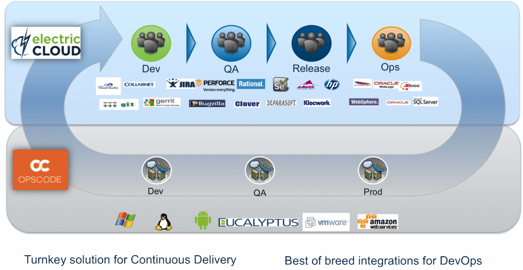 The “offering” itself is a Chef plug-in for the Electric Cloud DevOps platform which enables Electric Cloud customers to define, build and manage infrastructure using Opscode Chef. This Chef-managed infrastructure can then be automatically and contextually used for application deployments and release process tasks, across the dev, test and production stages and environments.