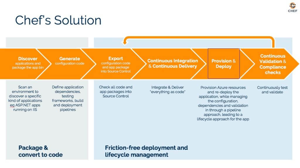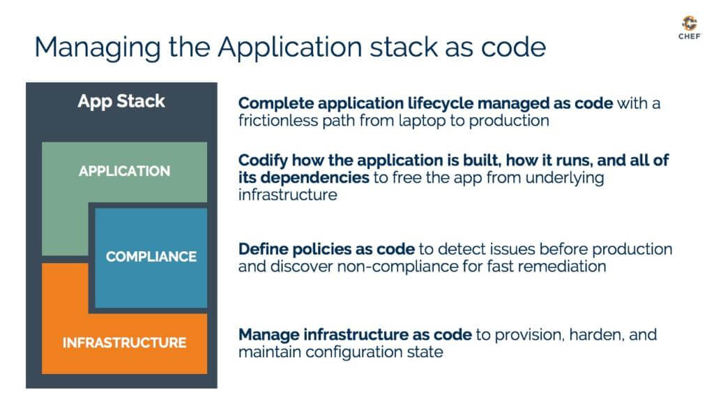 Chef offers a unique solution to enable easy and efficient migrations by managing your entire application stack as code. By defining the application, it’s dependencies, it’s compliance policies, it’s infrastructure — everything — as code, you enable an easy and scalable migration path for all your applications.
