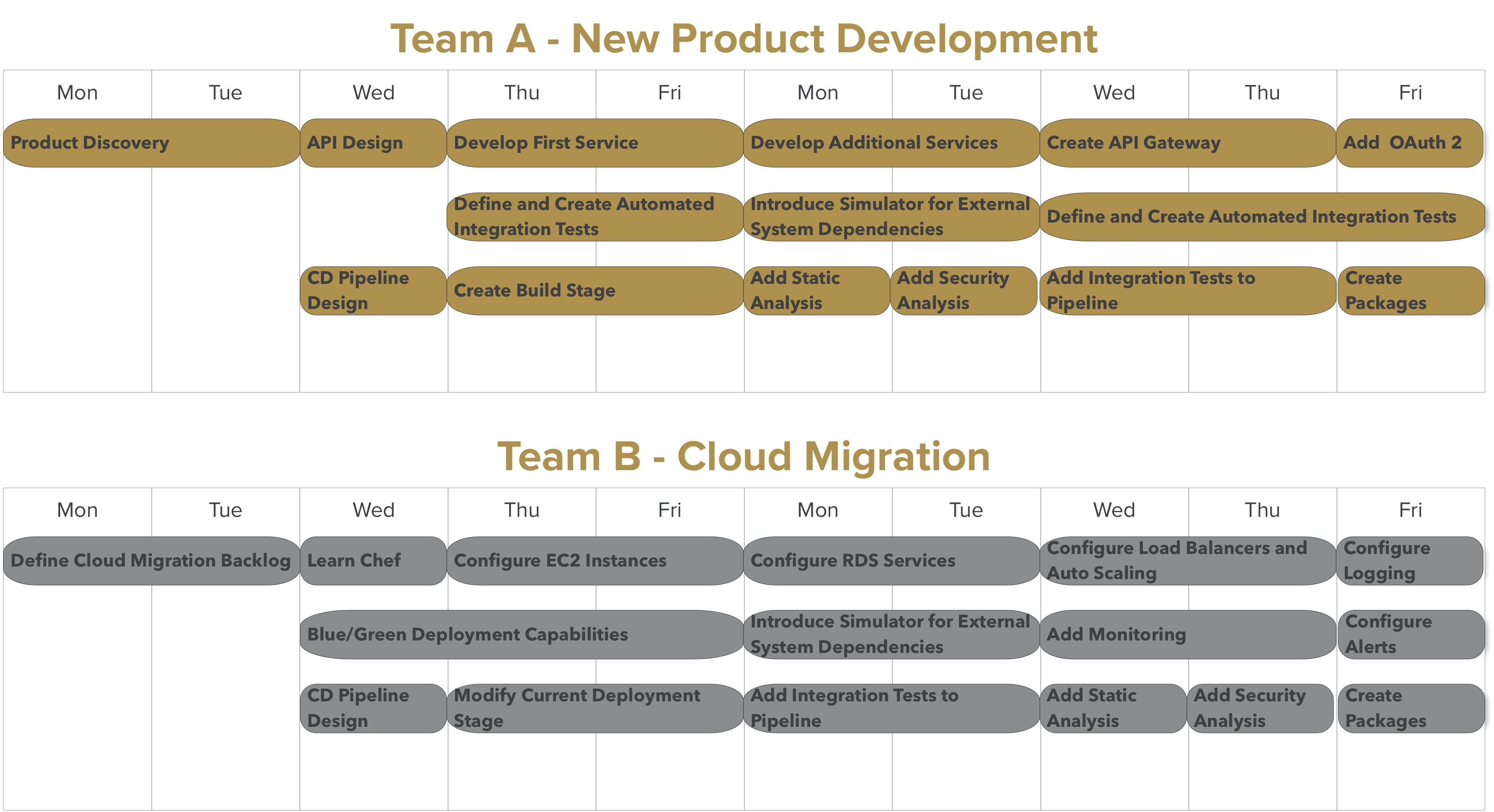 Another significant difference between Dojo experiences and typical training events is that the Dojo is not organized around a specific curriculum. Dojos are staffed with coaches having various skills who can meet the team where they are. A typical Dojo experience usually involves work on the team’s continuous delivery pipeline. For some teams additional learnings might be focused on microservice and API design while other teams focus more on improving automated testing or product discovery capabilities.