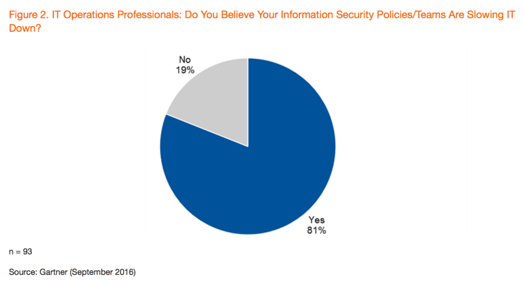 Many organisations tell me that they’re compromising their ability to move fast with their security responsibilities. Based on a Gartner report, 81% of IT operations professionals say they believe information security policies slow them down.