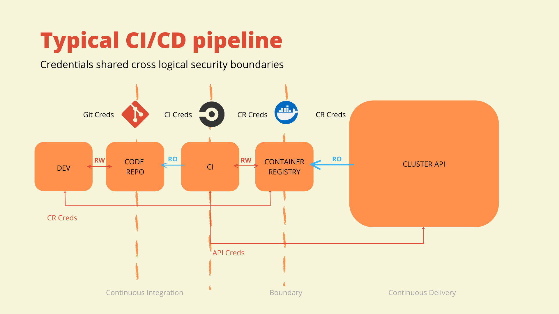 The above diagram depicts a typical CI/CD pipeline. There are typically several credentials that are used throughout a CI/CD process. They can be shared within logical security boundaries, but crossing these boundaries is less than ideal.