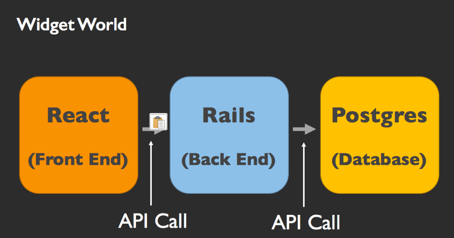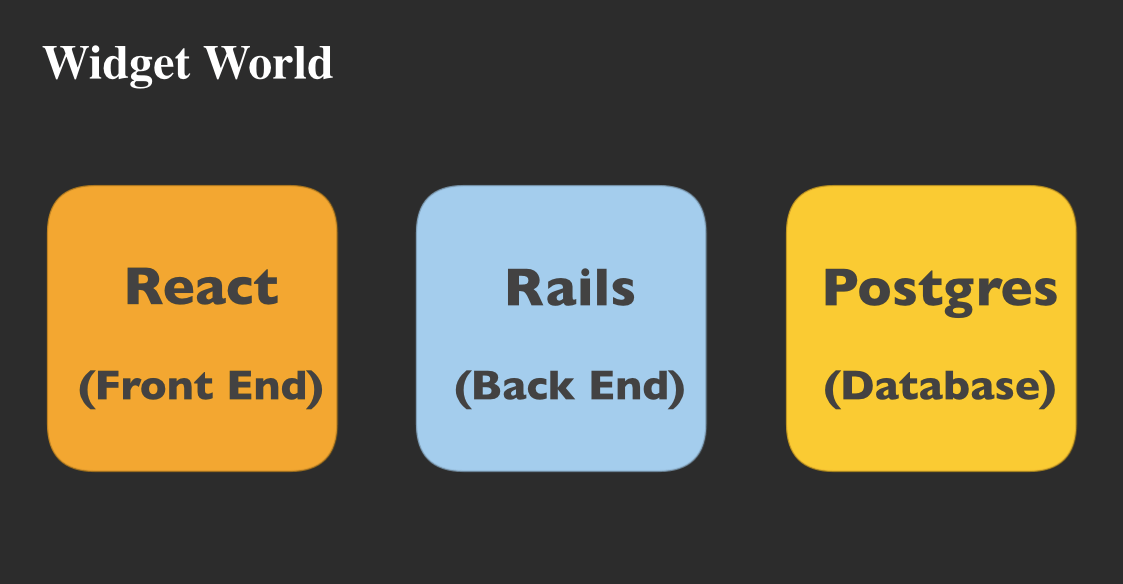 When a user visits the site, they will first see the front end rendered in React. When they request a list of widgets, the React front end will make an API call to the Rails backend, then the Rails backend will request the raw data from the Postgres Database, then format that raw data and pass it back to the React front end, which will render it for the user.