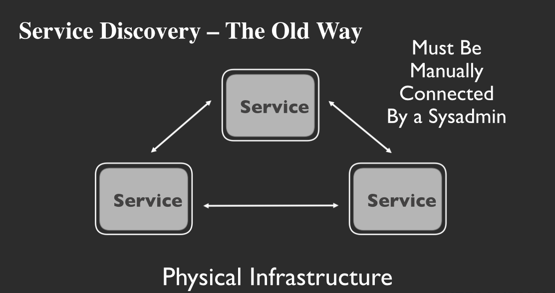 In the days of physical and static infrastructure, this service discovery happened manually. Any time a new service was added, a sysadmin would have to make all services aware of the new one – usually be manually changing a config file on each service. While this can work decently for static infrastructure, it does not work in the age of dynamic services that come and go quickly.
