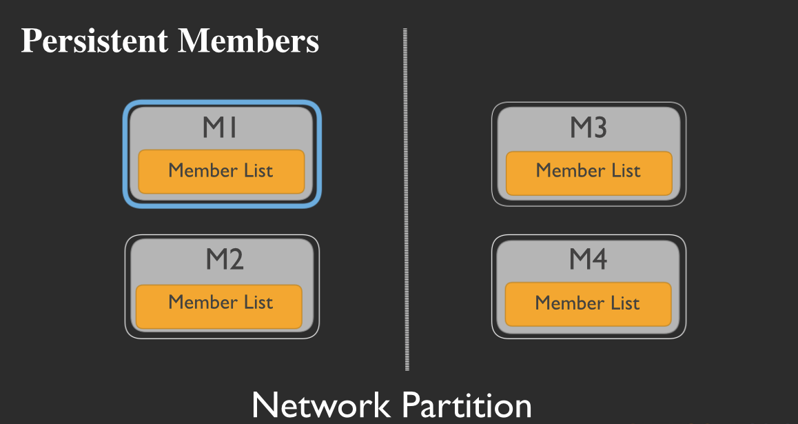 However, rather than marking the member dead and stop looking for it, M3 and M4 will continue to look for M1. Then, if the network partition heals: