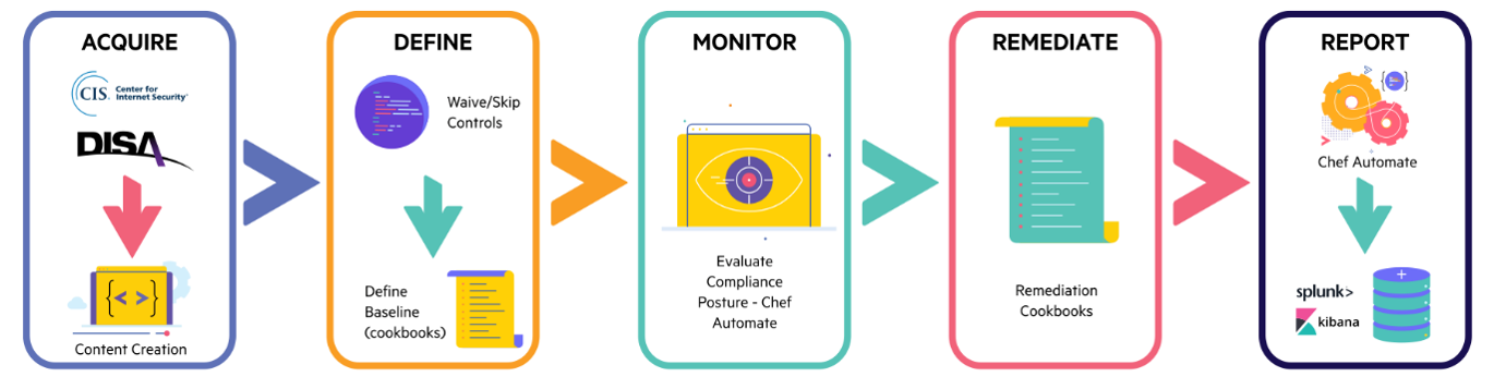 - Acquire: Customers select required CIS and STIG benchmarks. The Chef development team converts controls into Security Content Automation Protocol (SCAP) format, develops high-quality automated cookbooks and performs quality checks.