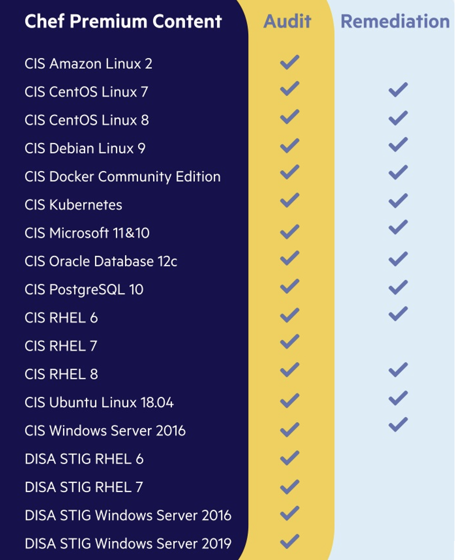 Chef Compliance includes 70+ relevant CIS Benchmarks, with new updates and profiles added every two weeks to help enterprises maintain security and compliance. Learn more about CIS and DISA STIG Curated Content for Auditing and Remediation.