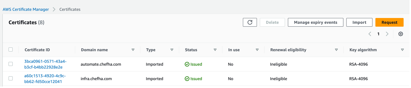 o Set chef_server_lb_certificate_arn with the arn value of the Certificate created in AWS ACM for the DNS entry of chefinfraserver.example.com