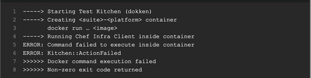 • Commands inside the container failing to execute correctly, causing Kitchen runs to exit with errors
