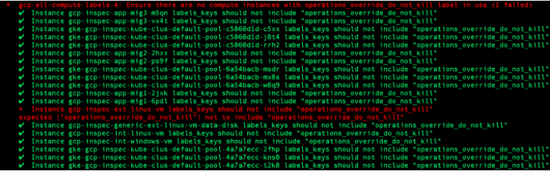 This is slightly more involved so let’s step through through what’s happening. Supplying only the GCP project name to this control, we first retrieve all available zones and loop over them. For each zone the list of compute instances are then also retrieved. Next we examine each compute instance individually and confirm whether or not our favorite “operations_override_do_not_kill” label is present.