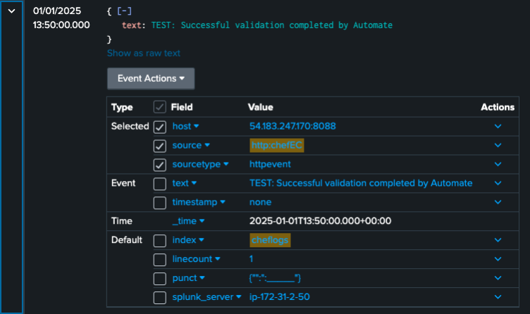 - Confirm the connection between Splunk and Automate by going to the "Search & Reporting" section and searching for index=cheflogs. You should see the validation message as an output.