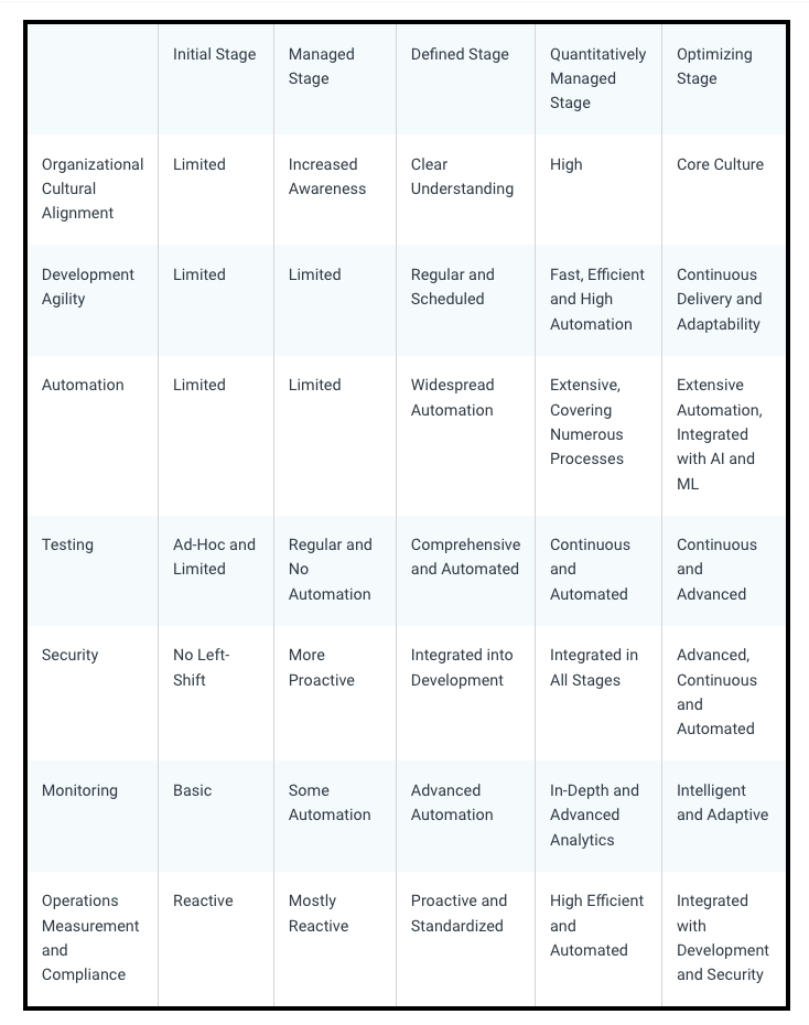 The DevSecOps adoption Model typically involves five stages of maturity. The maturity level of the organization can be determined by assessing the level of the seven core areas discussed above, as is seen in this table: