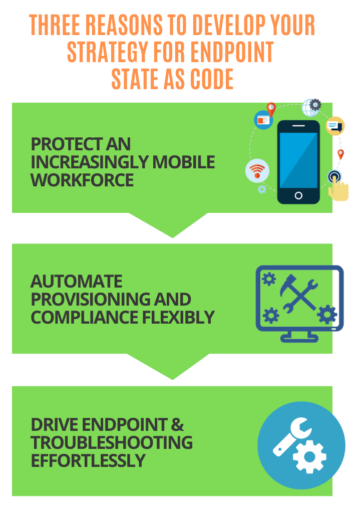 IT endpoint management used to be an uncomplicated game—managers used custom images while configuring systems to get new employees ready for work. This was an easy manual process, and systems were quickly deployed with desired configurations, applications, and security settings. Even during deployment, issues about specific systems were identified and resolved with minimal impact on other devices in the network. Servers used to reside within physical data centers where they could be identified and accessed whenever required.