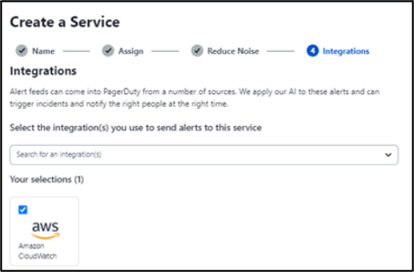 Starting with PagerDuty, there is a built-in integration that can be selected as part of the creation of a PagerDuty Service. By Selecting the AWS CloudWatch integration, a unique URL is created which can be used within the SNS configuration to send alerts. Teams set up within the PagerDuty Escalation Policy will be notified when an alarm is triggered and when the system returns to a normal level.
