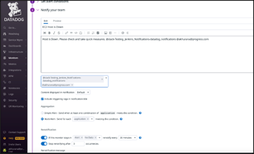 This flexibility ensures the right people and/or processes are notified when issues arise. Alerts are set as part of the Datadog monitors and can be configured under the Notify Your Teams section.