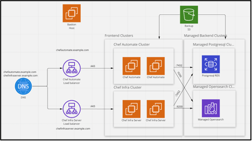 Chef Automate HA in the AWS cloud leverages managed services including OpenSearch and PostgreSQL components. This strategy benefits customers who have adopted AWS Services to take full advantage of the simplicity and scalability of the public cloud. This deployment involves using a set of standard scripts to automate the process of configuring the deployment process and required prerequisites, including creating EC2 instances, load balancers, security groups and subnets.