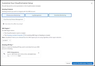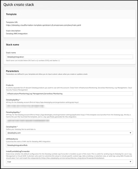The selection of Automatically using CloudFormation simplifies the integration by providing just a few parameters such as AWS Region, Datadog API key and other optional settings. Once provided, clicking the Launch the CloudFormation Template will redirect to the AWS console for the final remaining steps.