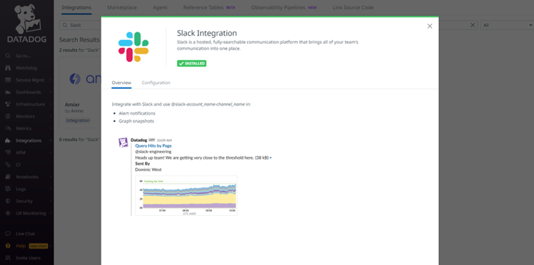 These integrations can be configured from within the Datadog User Interface. Simply select Integrations from the left-hand navigation and search for the desired communication solution.