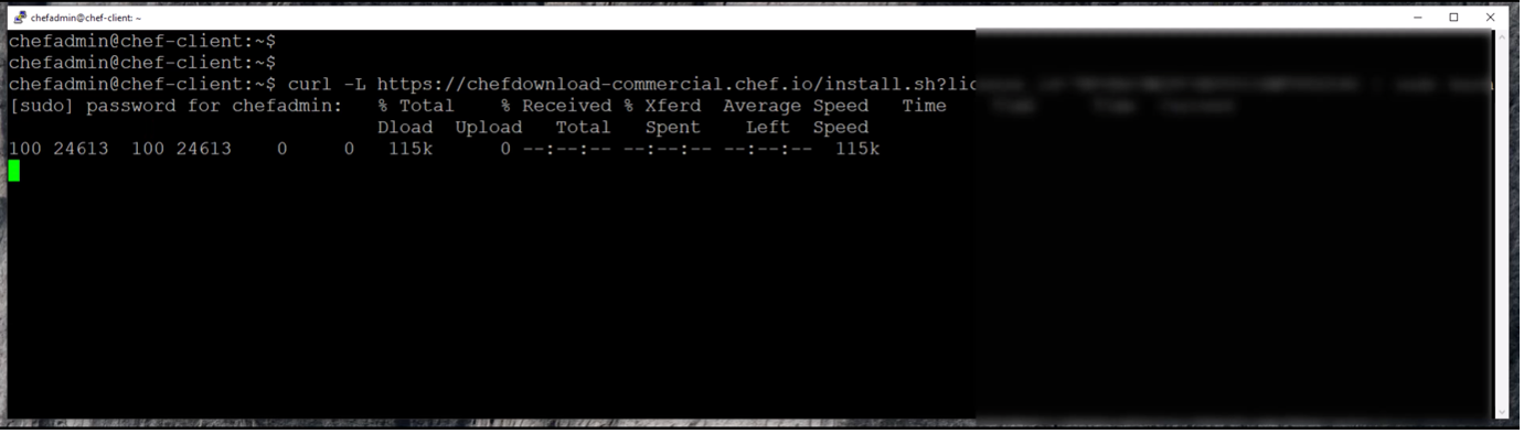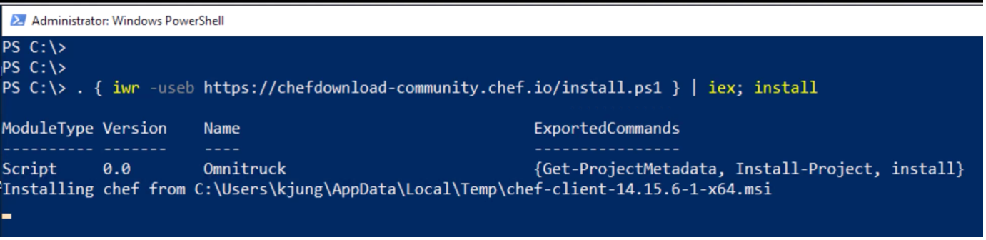 Similarly, for a Windows environment, using the install.ps1 script initiates the download and installation of the latest version of Chef: