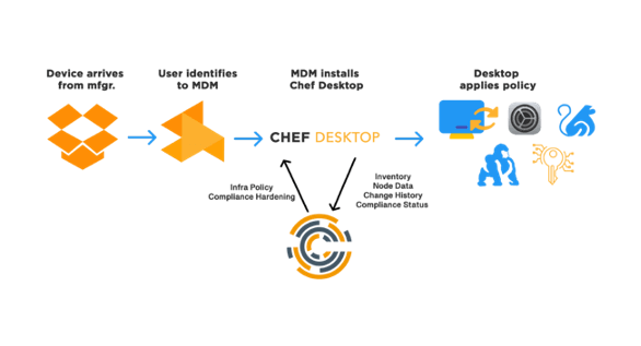 Chef Desktop automates Configuration Management by allowing codification of Infrastructure Configurations through policy files. This makes applying and maintaining configuration changes across a large fleet of machines faster and provides visibility into their real-time status. Besides automating configurations, Chef Desktop uses compliance-as-code principles to automate continuous security and compliance checks for endpoints to detect and remediate issues.