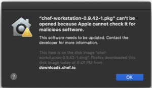 With the release of MacOS Catalina (10.15) we have become aware of an issue with our omnibus based installers. This only affects users who upgrade to MacOS Catalina. When trying to install the Chef Workstation by double-clicking on the .pkg affected users will see an error message similar to the following: