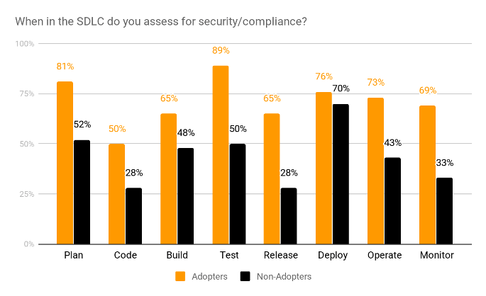 Organizations that have adopted DevSecOps practices, have assessed for security compliance in every stage of the SDLC, in stark contrast to the non-adopters who concentrated assessment in Plan, Test and Deploy.
