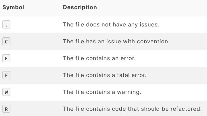 - For each symbol, the file name, line number, character number, type of issue or error, description of the issue or error and the location in the source code at which the issue or error is located