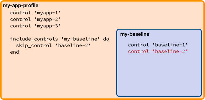 In the above example, all controls from my-app-profile and my-baseline profile will be executed every time my-app-profile is executed except for control baseline-2 from the my-baseline profile.