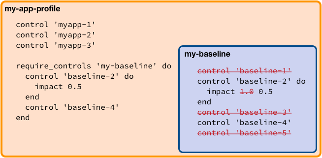 In the above example, all controls from my-baseline are executed along with all the controls from the including profile, my-app-profile. However, should control baseline-1 fail, it will be raised with an impact of 0.5 instead of the originally-intended impact of 1.0.