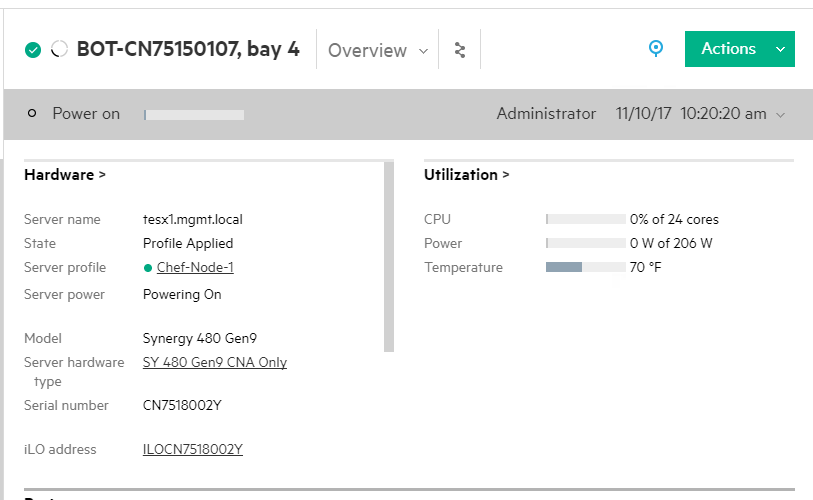 Network and storage wouldn’t be complete without their friend compute. We’ve got you covered there too. This example brings up a new physical server in enclosure 1, bay 2: